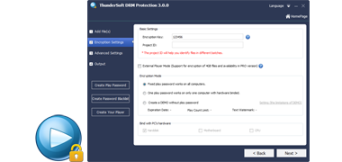 ThunderSoft DRM Protection is a DRM solution for video/audio/image/document files. DRM protected media files can prevent illegal copying and distribution, unauthorized users can not open them. Authorization key can be binding with end user's hardware, one device one key, specify its time interval and also blacklist feature included. Our software provide custom watermarks, custom player and many other advanced settings to help you complete your DRM protection.