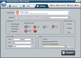 ThunderSoft Flash to HTML5 Converter is a professional Flash converter for SWF file to html5 video conversion. The output supports all major web broswers: IE, Firefox, Apple Safari, Chrome, Opera, and can be viewed in iPad, iPhone.