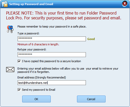 After install and lanch Folder Password Lock Pro, you need set your password for the account of Folder Password Lock Pro when you run at the first time. Make sure to remember your password or keep it in a safe place, because you can not run this program without it.