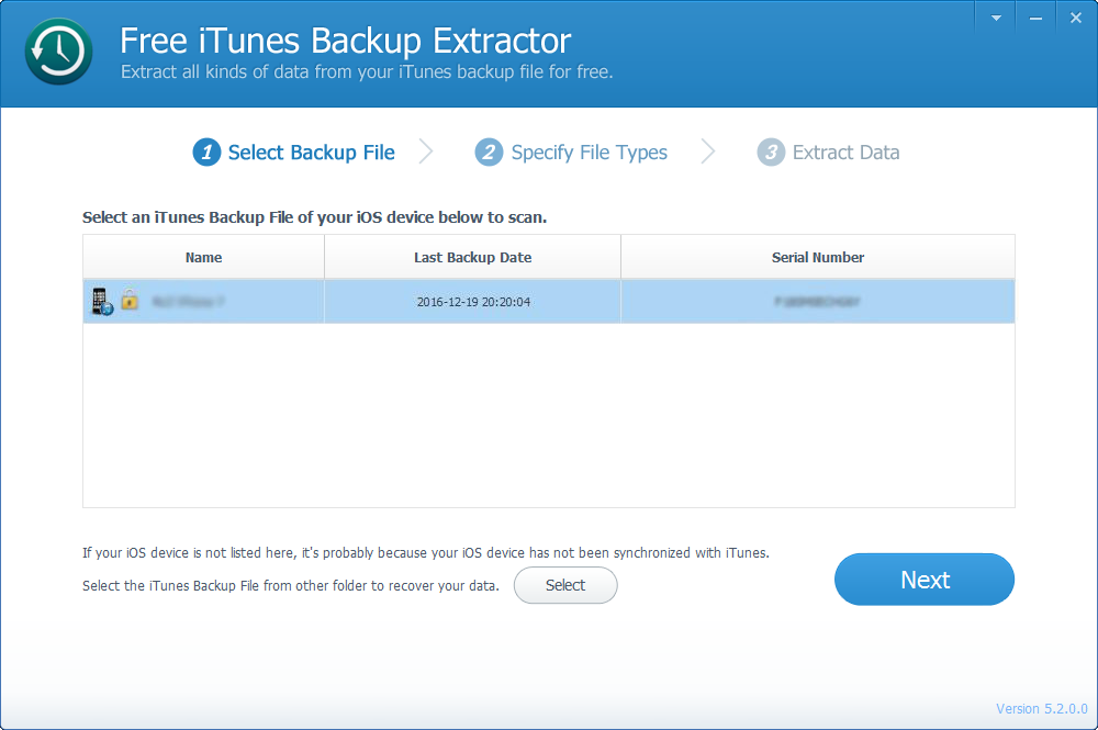 Select an iTunes backup file of your iOS device from the list. If your iOS device is not listed, you can select iTunes backup file from other folder you specified.