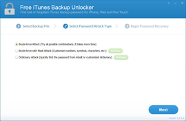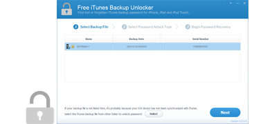 Forgot your iTunes backup password? Free iTunes Backup Unlocker is the solution to find your password back. Supports iTunes backup for all iOS devices, all types of iPhone, iPad, iPod touch. Its powerful decryption technique, three decryption methods, enables you quickly retrieve iTunes backup password without any damage to your backup data.