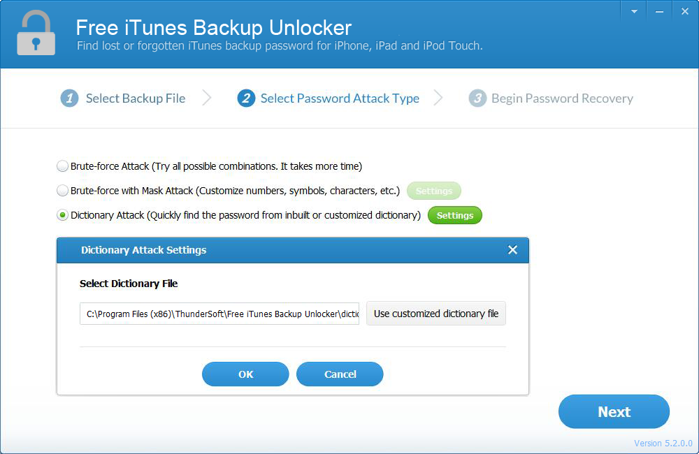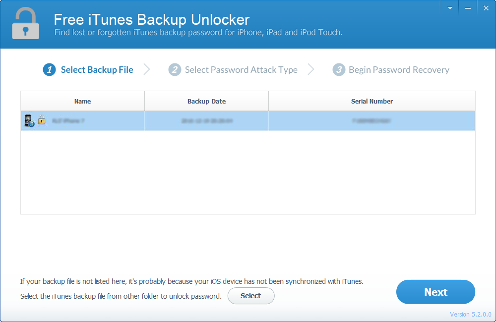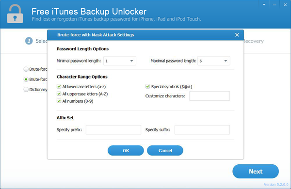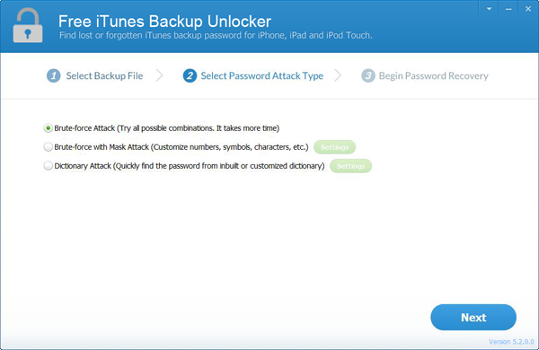 Free iTunes Backup Unlocker is the solution to find your password back. Supports iTunes backup for all iOS devices, all types of iPhone, iPad, iPod touch. Its powerful decryption technique, three decryption methods, enables you quickly retrieve iTunes backup password without any damage to your backup data.