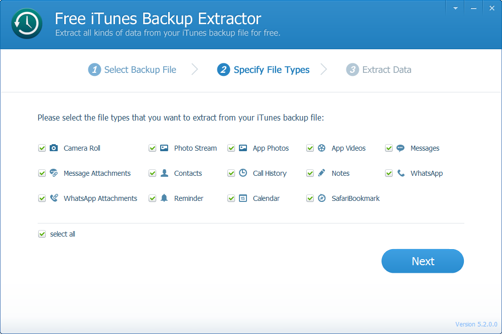 Specify file types you want to extract, if you want extract all data from your backup file, just leave the options all checked.