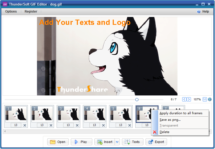 ThunderSoft GIF Editor is a handy tool to edit your gif files, easy to preview every frame and change duration. Help you adding multiple texts and logo, removing frames and adding pictures as new frames, keep the original image quality as much as possible, also good at creating gif animation from image files.