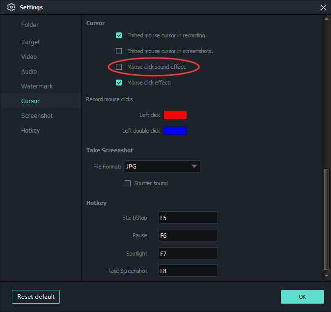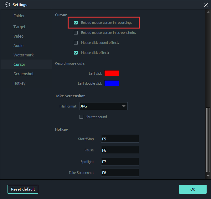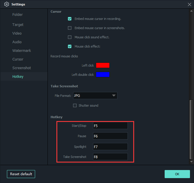 The default hotkey is showing as follows, you can change the hotkeys according to your own needs.