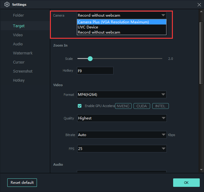 Please select the correct audio device in the "Audio" drop-down menu. You can adjust the recording volume of the device you want to record. If you want to record both microphone and game sounds, please select "Computer sounds and microphone".