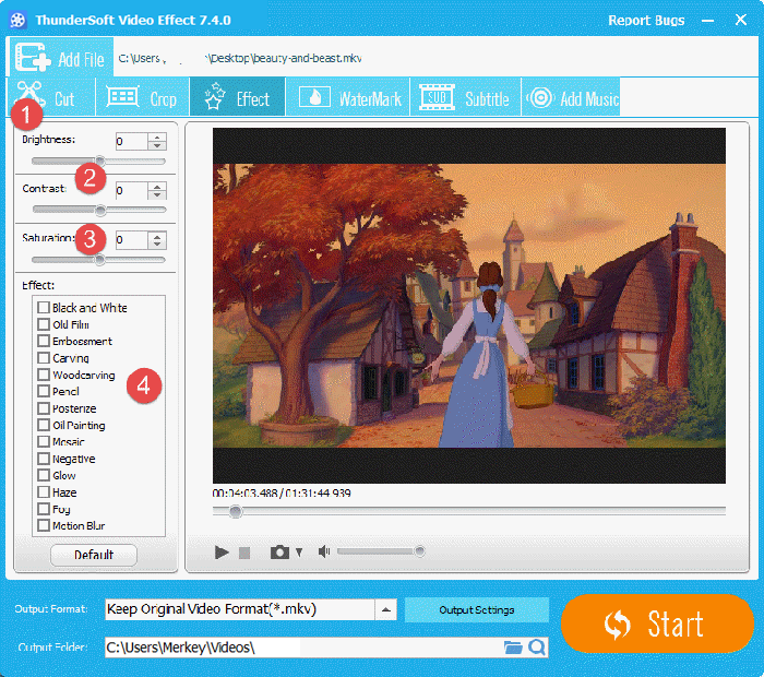 5. You can also add some pre-designed special effects to your video such as Black and White, Old Film, Embossment, Carving, Woodcarving, Pencil, Posterize, Oil Painting, Mosaic, Negative, Glow, Haze, Fog, and Motion Blur.