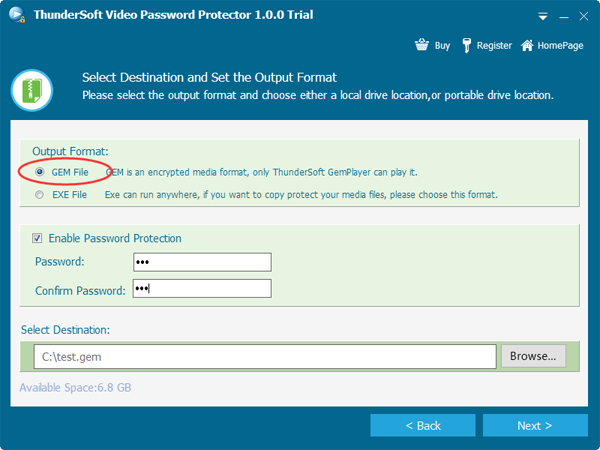A: GEM format (.gem files) is an encrypted video format. Use Advanced Encryption Standard (AES), which have a very high level security. With this format, you can keep your video data safe, because no common video player can open it. Even installed the specified player, you also need a password to unlock it.
